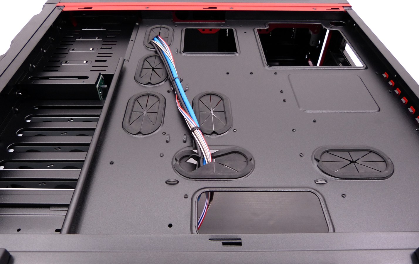 El cableado de conexiones nace de la frente de módulo superior. Al traer perforaciones de paso entre los 2 módulos, no tenemos problema de paso alguno. La gestión del cableado está muy bien lograda, incluyendo los cables adicionales de las fuentes de alimentación, de los cables SATA e incluso de los tubos RL.