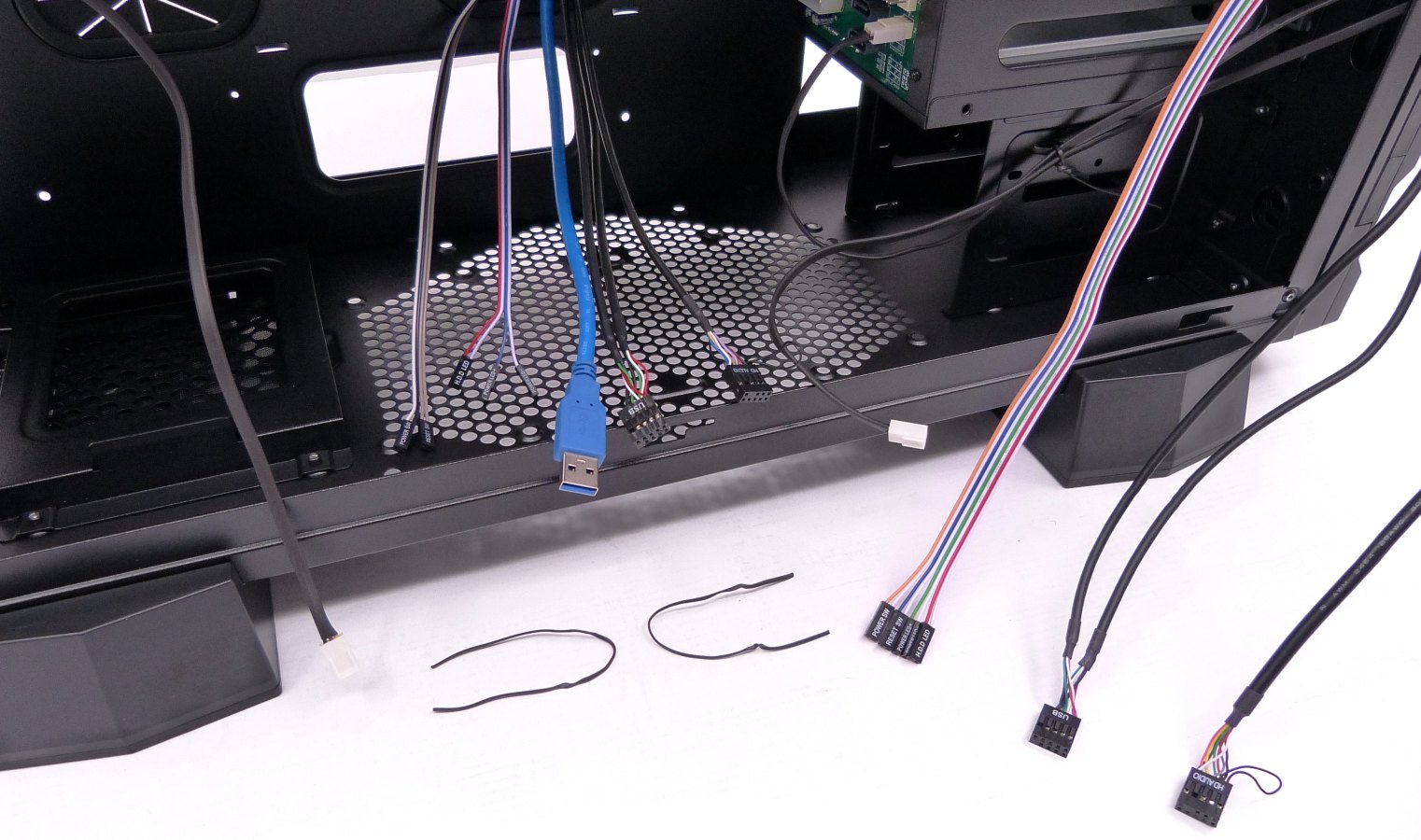 El cable para conectar el frontal de audio al equipo inferior queda muy justo si lo pasas por detrás, por lo menos en mi caso.