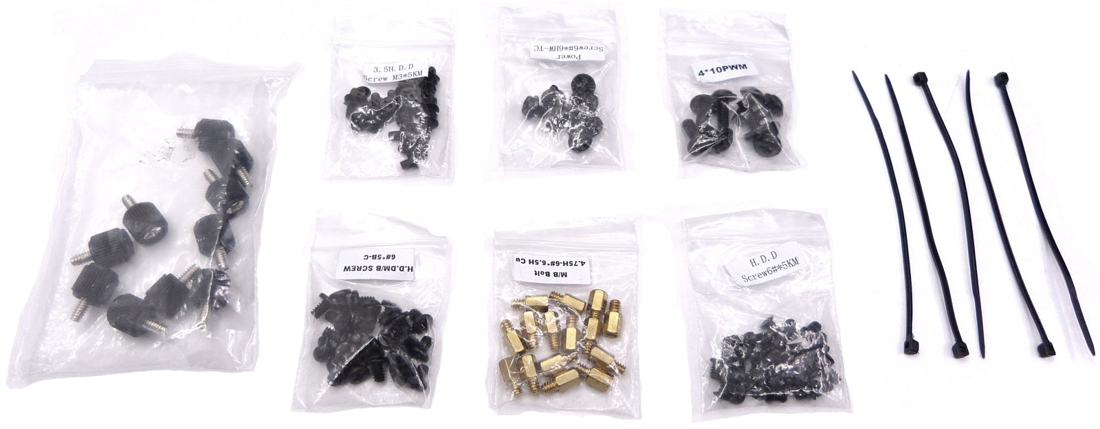 El kit completo de tornillos es bastante amplio. Eso sí, está muy bien ordenado y eso nos encanta. Generalmente los fabricantes nos adjuntan los tornillos todos juntos en una bolsa y a correr. NOX nos ha querido facilitar las cosas con la separación de los tornillos clasificados por categorías, señaladas en cada bolsa de cierre hermético individual. Además, se adjuntan 5 pequeñas bridas para recoger los cables. Quizá más bridas no hubiera estado mal.