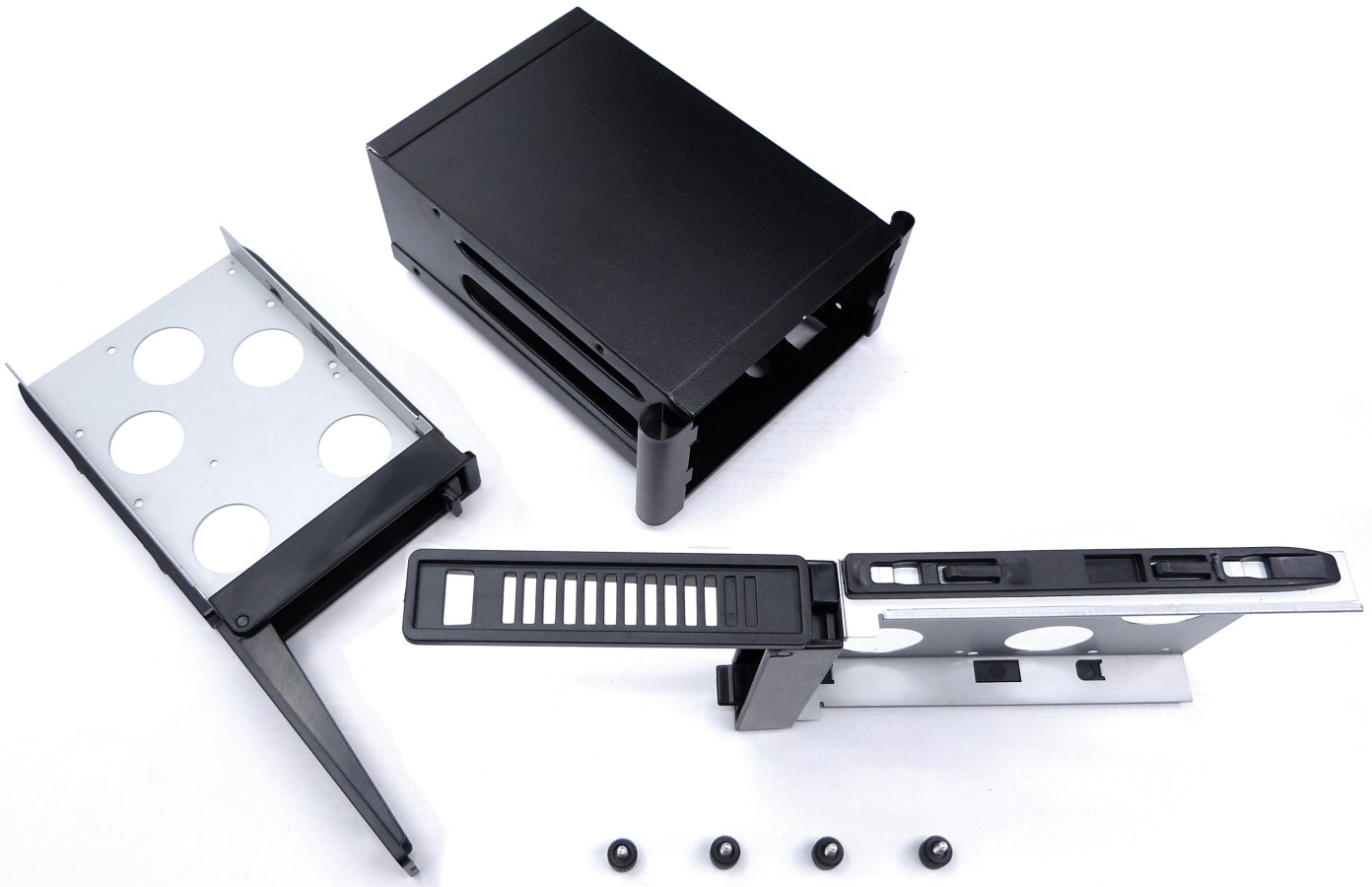 En el módulo superior podemos encontrarnos con este compartimento doble para dar cabida a dos de estas bandejas, vistas anteriormente. Este compartimento también sirve para conectar 2 discos duros más con el sistema «Easy Swap», de fácil sustitución de cada dispositivo. Dicho compartimento se arma con 4 tornillos, 2 por cada extremo de la base.