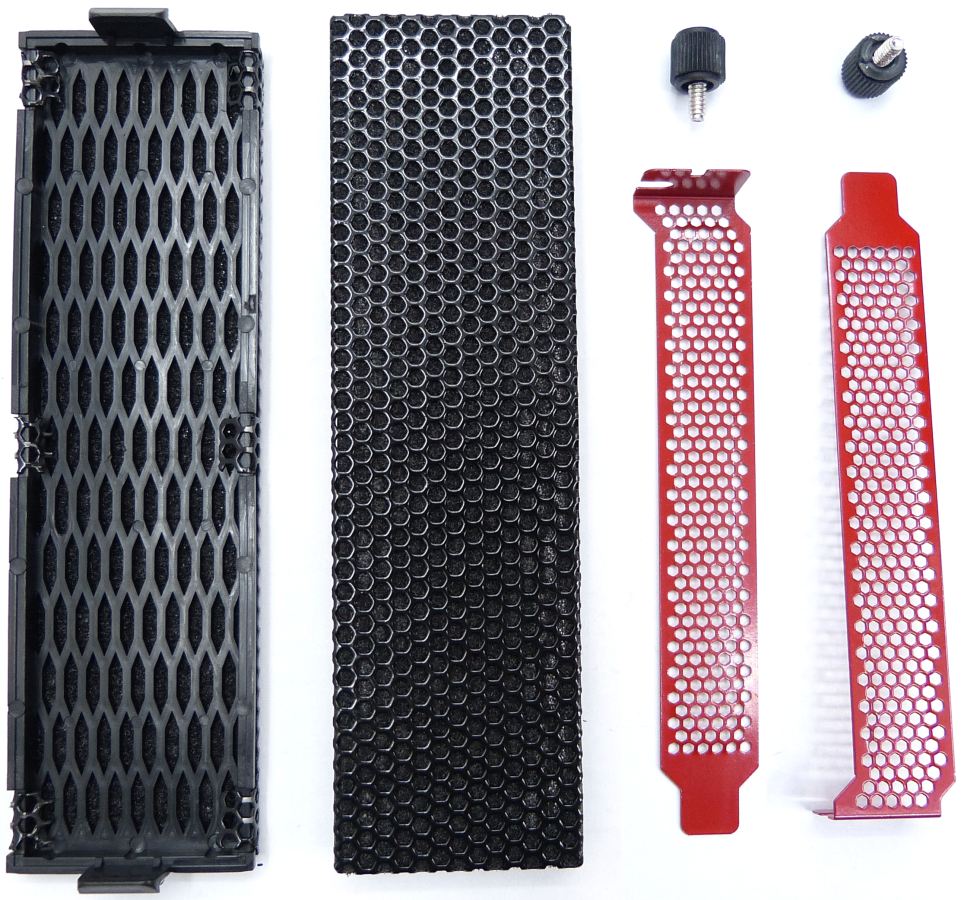 El frontal de la supertorre está equipada con estas tapas, qe combinan el plástico ABS, el metal Mesh y un filtro intermedio para el polvo. Dispondremos de 2 + 4 unidades que se fijan con pestañas laterales. En la parte trasera tenemos las placas metálicas PCI microperforadas, para permitir ventilación. Hasta un total de 10 + 1 de estas placas vienen preinstaladas, pintadas totalmente en rojo.