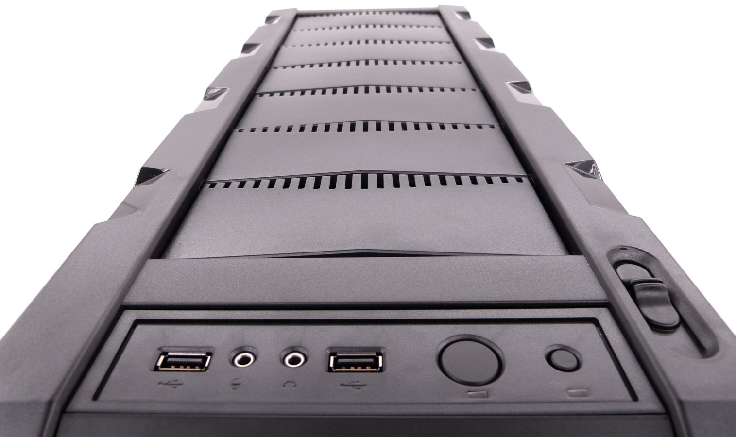 El doble panel de control y conexiones está construido de una sola pieza. La línea superior pertenece al módulo superior, y la inferior al módulo inferior. Ambos paneles poseen los 2 botones de encendido/apagado y reinicio, claramente identificados por símbolos y por tamaño. También vienen equipados con dos LEDs de estado de encendido y actividad de las unidades de almacenamiento de datos. Ambas líneas vienen con 2 puertos USB 2.0 y los 2 conectores tipo jack de 3.5mm para auriculares. Además, la línea inferior posee un puerto adicional USB 3.0, que deberemos conectar a la trasera de la placa base.