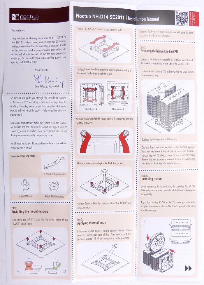 El manual de instrucciones se limita a explicar en inglés el montaje del socket LGA 2011 y el montaje/desmontaje de los ventiladores. Para poder atornillar los dos tornillos ya preinstalados en el disipador, hace falta desmontar el ventilador central, consiguiendo libre acceso a los mismos.