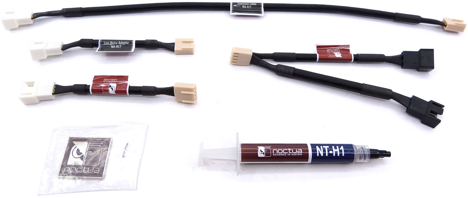 El resto de piezas las conforman los cables adjuntos. Un alargador, dos reductores de tensión y uno en configuración en «Y» para empalmar 2 entradas de ventilador. Los 4 cables son compatibles con la tecnología PWM, incluyendo los reductores. Traen conectores macho y hembra de 4 pienes en los extremos. Por otro lado, viene adjunto el famoso compuesto térmico de elevada conductividad Noctua NT-H1 que conjuga perfectamente con el disipador; compuesto térmico de elevadas prestaciones con disipador más ventiladores de elevadas prestaciones, un conjunto equilibrado.