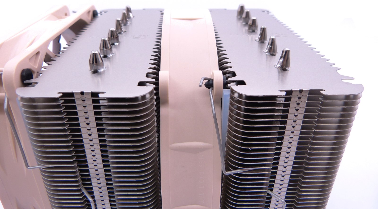 Gracias al sistema de amarre empleado por alambres y a la configuración del corte de cada lámina se permite regular en altura ambos ventiladores. De modo que si se encuentra con un problema de montaje por algún disipador u otro elemento que bordee al NH-D14, se puede regular la altura de cada ventilador, sobre todo el colocado en el frontal.