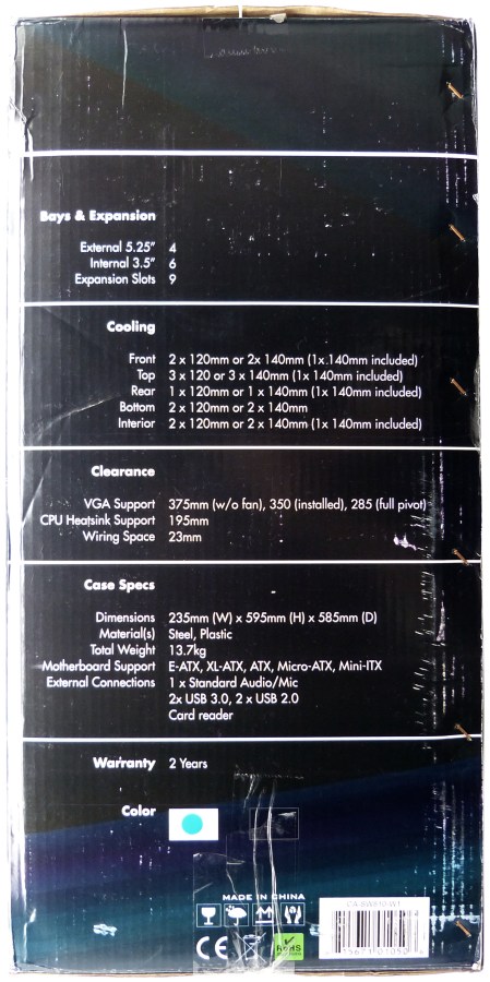 Ambos laterales se delimitan a explicar las características por una cara en hasta 8 idiomas y las especificaciones técnicas del producto. Se indica también el color predominante de la torre, o bien en blanco o bien en negro, así como su garantía limitada de 2 años.