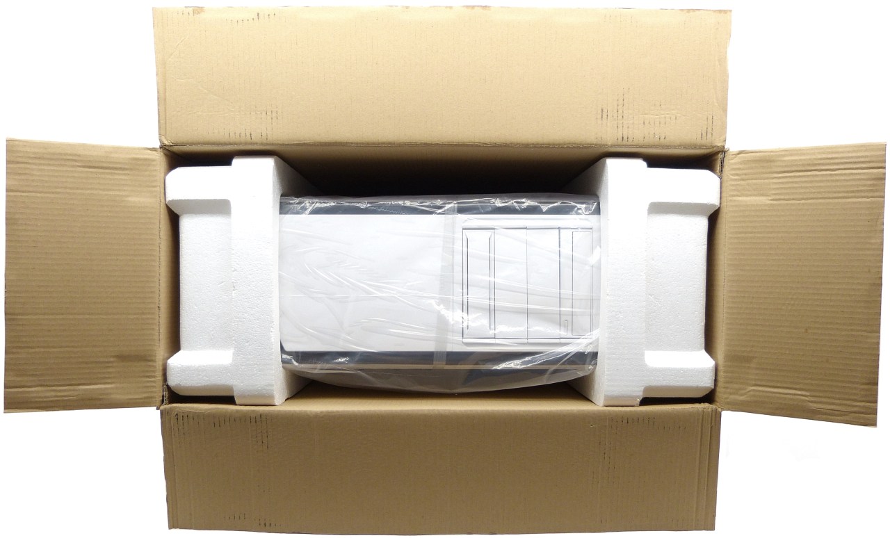 - Caja de cartón de buena calidad, sin asas, bastante resistente y preparada contra lluvia, para transportar y presentar el producto.
