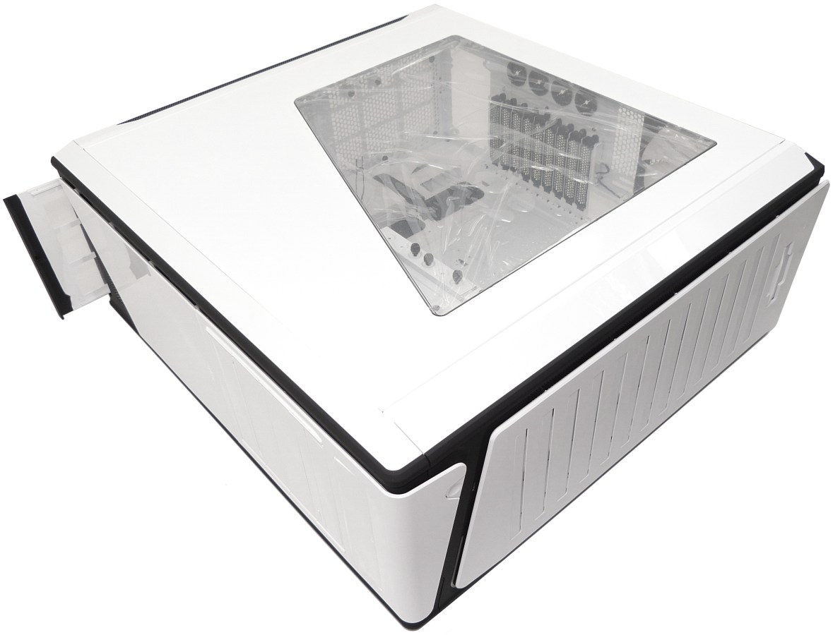 Tal como está concebido el volumen de una torre para PC de hoy en día, siempre hay 6 caras exteriores a diseñar, en la que buena parte de ellas se pueden realizar independientemente del espacio interior. Aunque generalmente no es así, la Switch 810 es un gran ejemplo de ello. El chasis interno está formado por el típico cubo de metal de acero tipo SECC, completamente pintado en blanco brillo, recubierto por un marco frontal de plástico extraíble de doble pieza, un lomo de plástico también extraíble, con un sistema especial de abertura para paso de la ventilación y una base con doble filtro antipolvo, cada uno extraíble de doble raíl.