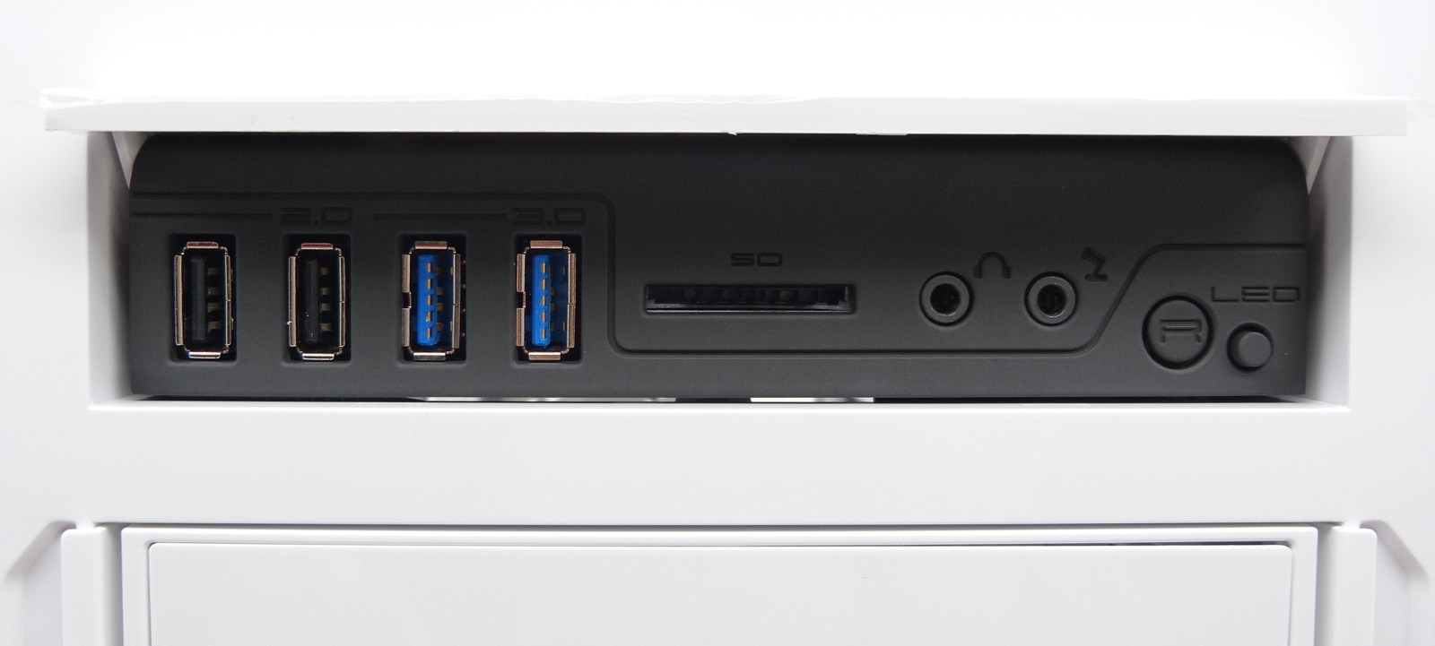 El panel de conexiones frontal es uno de los mejores que hoy por hoy vamos a encontrar en el mercado equipado de serie en una torre, por varios motivos. Este panel está incrustado en el interior del frontal superior, con una tapa abatible hacia arriba, bastante resistente. Este sistema de abertura, garantiza la mínima penetración del polvo en el frontal, a la vez que da continuidad al frontal una vez cerrada.