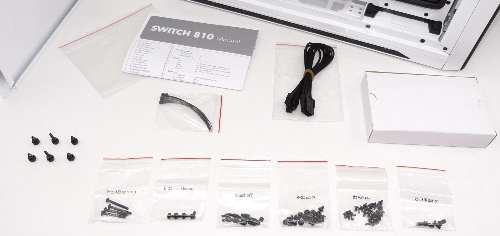 8. NZXT SWITCH 810. Detalles Interior I. Componentes y Accesorios. Manual, Kit de Tornillos, Bridas y Cables…