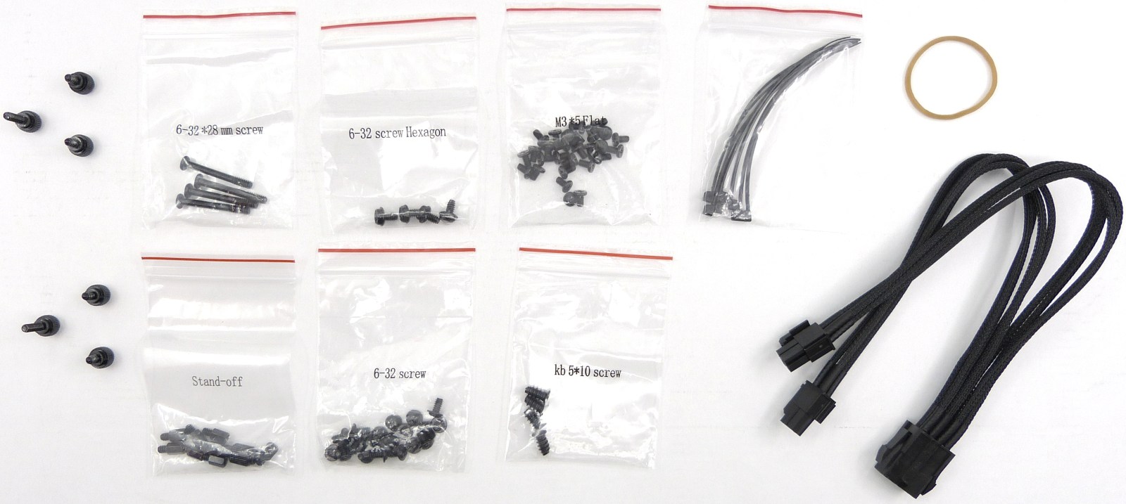Cada vez nos gusta más que los fabricantes nos ofrezcan todo un kit de tornillos clasificados y separados para no tener que liarse con ellos. Hasta 6 bolsas con variados tornillos de montaje dispondremos para montar cualquier dispositivo con garantías, además del resto de tornillos que ya vienen preinstalados. A parte, el cable alargador viene enfundado y es de buena calidad, todo un detalle por si el cable de la fuente no llega a bordear por detrás hasta alcanzar el conector de la placa base. Por último, tenemos a nuestro alcance 8 bridas más que duplican las bridas ya preinstaladas, que ya recogen los cables a lo largo de toda la zona de la gestión del cableado y que veremos más adelante.