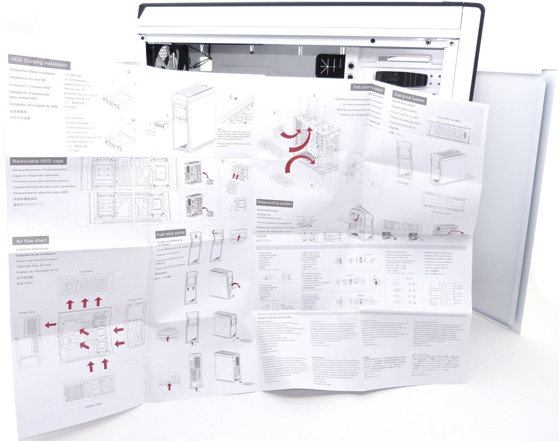 El manual de instrucciones esta vez es una gran hoja desplegable traducida en hasta 7 idiomas, donde se detalla cada rincón de la torre y su correcto montaje y desarme, así que no tendremos prácticamente ningún problema para entender todo el procedimiento y todas sus partes. Curiosamente tenemos acceso a otro manual más resumido en la web oficial de NZXT en formato PDF aquí: manual NZXT Switch 810.