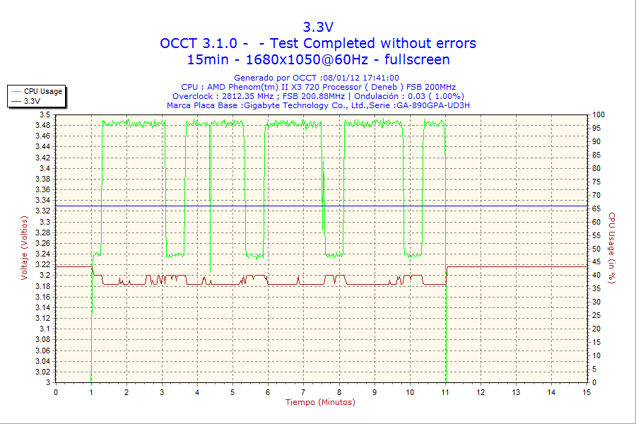 TACENS VALEO III 500. Software OCCT v3.1.0. Prueba PSU 3.33V