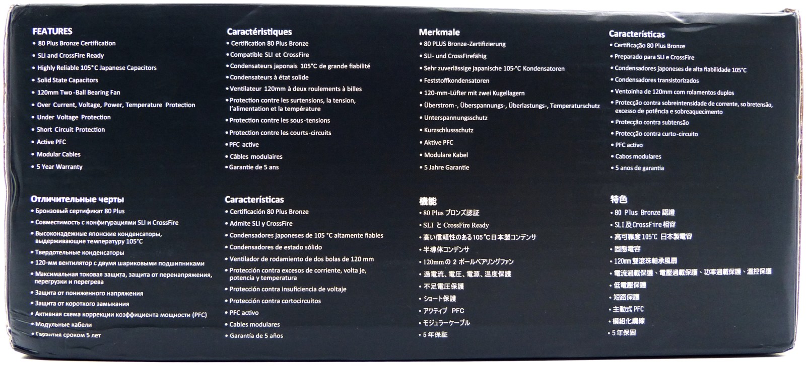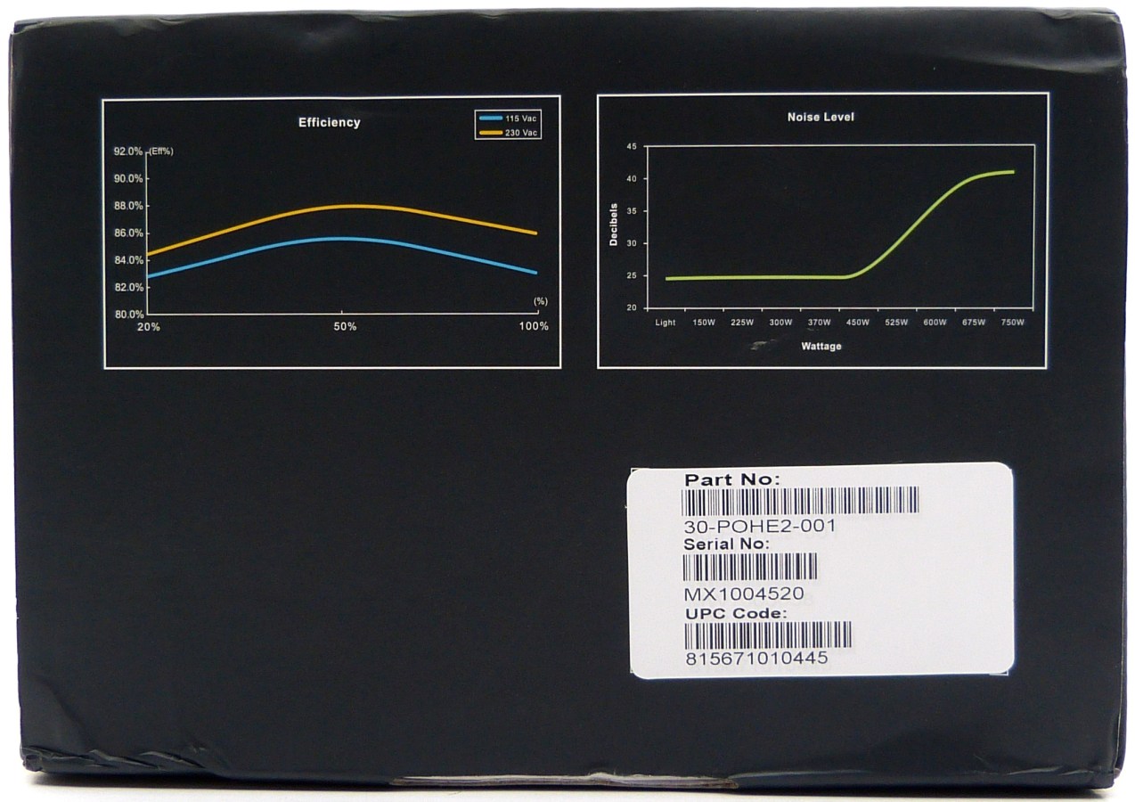 - Detalle de todas las caras más relevantes de la fuente. Se centra en la cara trasera (de entrada), en la cara delantera (de salida, con o sin panel de conexiones modular), y la cara lateral/superior o inferior que muestra la pegatina de las especificaciones técnicas y advertencias.