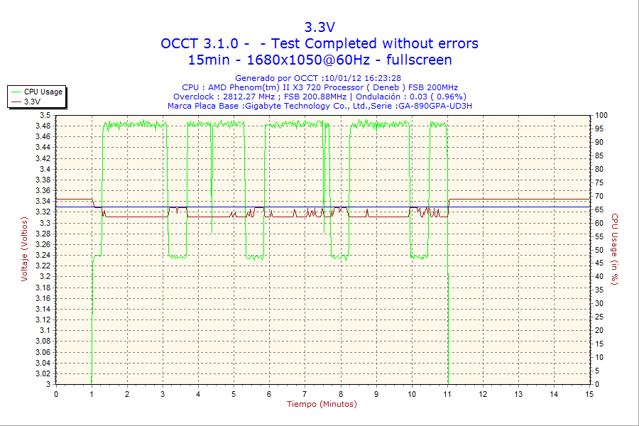 LC POWER LC8850II V2.3 ARKANGEL 850. Software OCCT v3.1.0. Prueba PSU 3.33V