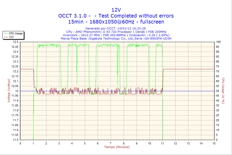 LC POWER LC8850II V2.3 ARKANGEL 850. Software OCCT v3.1.0. Prueba PSU 12.00V