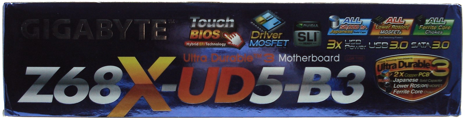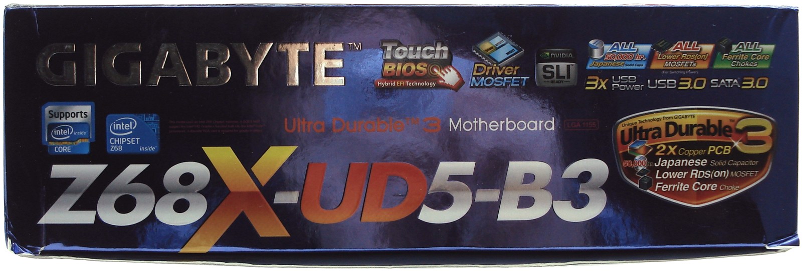 Para empezar, tanto en la parte superior como en la inferior del embalaje, está repleto de información referida a las características de la placa base, ya citadas en la página 1 de este mismo análisis, y remarcadas con diferentes logos y descripciones, únicamente en el idioma inglés. En realidad cuesta lo suyo leerse todo lo que nos dice la caja, no por la dificultad, sino por la cantidad. Si nos fijamos bien, Gigabyte nos bombardea con información en todas las caras del embalaje, donde se destaca la conocida tecnología Ultra Durable 3 de Gigabyte, con 3 características para mayor rendimiento y durabilidad en electrónica: condensadores sólidos japoneses de mayor durabilidad, mejora en la resistencia de paso por la doble capa de cobre de doble grosor implementada, uso de drivers Mosfet para mejora en la demanda de energía VRM para la CPU, así como componentes Choque con núcleos de ferrita para mayor eficiencia energética y en conjunto disminuir la temperatura generada. Además, se destaca la nueva incorporación del software bajo Microsoft Windows como una alternativa más para manejar la BIOS, con «Touch BIOS» (Tecnología Híbrida EFI), compatible con pantallas táctiles. Si eso parece poco, cabe destacar el denominado «333 Onboard Acceleration» de Gigabyte, con puertos USB 3.0, SATA 3.0 y USB power 3x, con puertos USB On/Off Change, así como soporte para doble tarjeta gráfica ATI Crossfire o NVIDIA SLI y Dual BIOS de Gigabyte. Por último, el socket Intel 1155 viene reforzado con 22 fases de energía con abastecimiento dual, controlable bajo software. El resto de características del equipamiento de esta placa base las seguiremos viendo a lo largo de este análisis.
