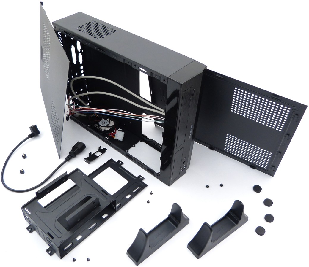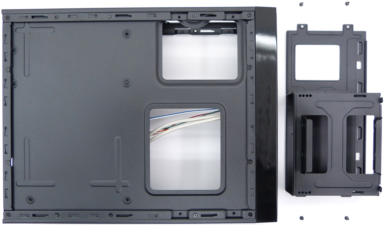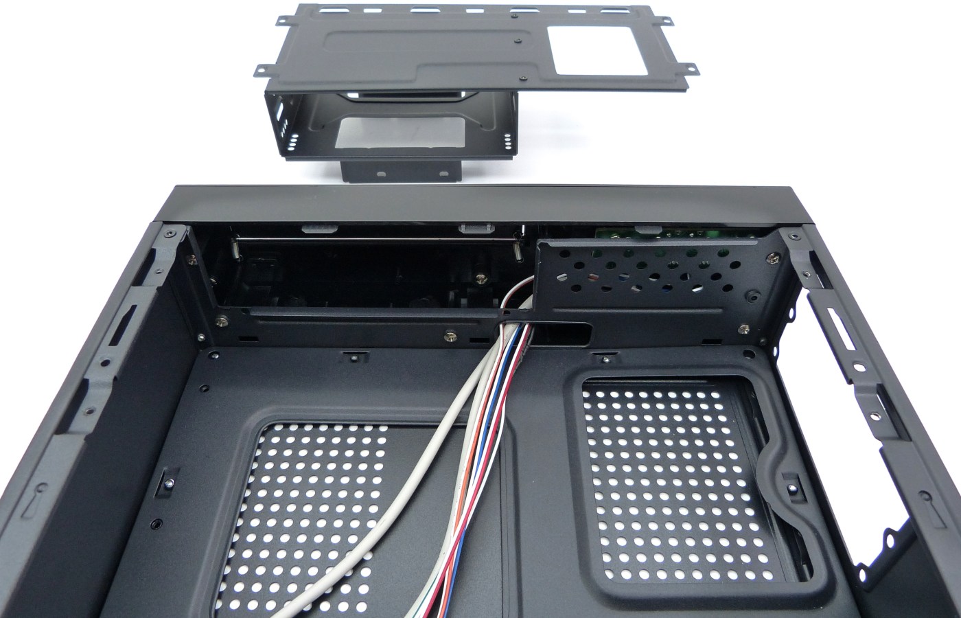 El compartimento interno delantero puede desmontarse para facilitar el montaje de los dispositivos delanteros. Está pensado para poder montar todo el interior con este compartimiento separado, y montar finalmente el compartimiento con los 2 dispositivos ya fijados, la unidad DVD o BR y el disco duro o unidad SSD con adaptador pertinente, sin estorbar a la instalación de la fuente de alimentación.