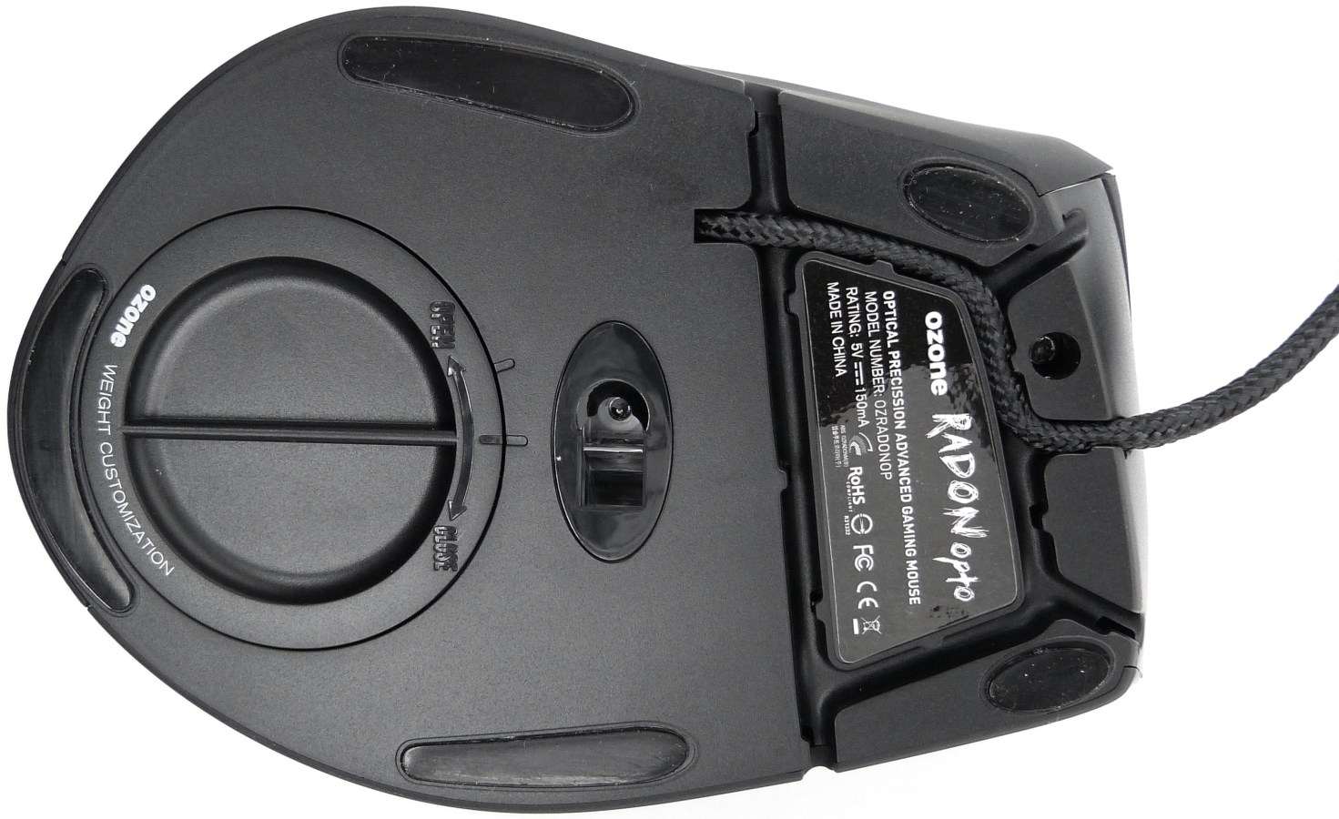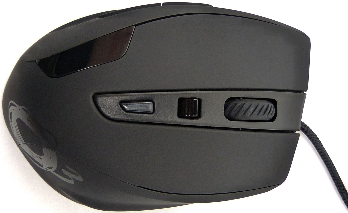 La parte envolvente superior está dividida en 4 zonas, las 2 laterales destinadas a su ergonomía para mejor agarre y apoyo de los dedos extremos, los botones derecho e izquierdo de gran formato, la columna central con 5 funciones a través de 3 dispositivos (botón, interruptor autoabatible de doble posicionamiento y rueda giratoria/botón central), y por último su ventana de LEDs rojos intentando cubrir la zona que deja la mano descubierta comprendida entre el dedo pulgar e índice.