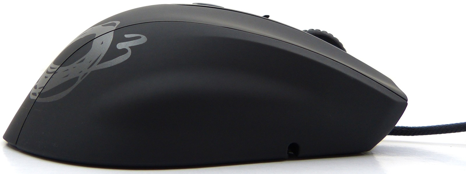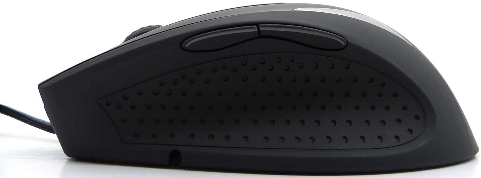 Los laterales normalmente se emplean para conseguir facilitar el agarre del ratón para levantarlo y mayor acople de la mano para apoyarse en él cómodamente. Tal como podemos ver, la zona izquierda conserva los típicos botones con función «siguiente» y «atrás» y un recubrimiento especial de goma granulada para asentar ahí el dedo pulgar. En cambio la zona derecha ha sido la zona más olvidada del ratón limitándose a una ligera doble línea de trazado para los dedos meñique y anular…