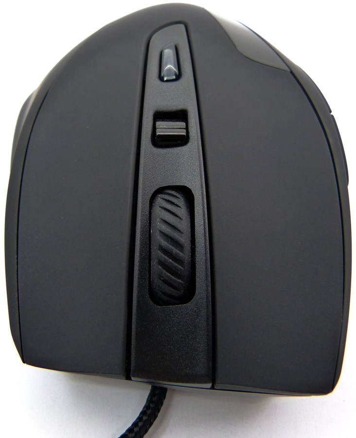 El primer detalle está relacionado al acabado superior del ratón. En tal acabado se emplean 3 materiales, plástico ABS, capa de forro superficial para contacto, y goma en el lateral y en la rueda giratoria. Dispone de las 8 funciones accesibles a través de botones y la rueda listadas anteriormente. El resto lo conforman el LED de triple color y los 4 LEDs rojos para indicación de la precisión. El material de mayor desgaste, inevitablemente será la capa fina de forro superficial que le caracteriza al plástico de un tacto similar a la goma de pulido suave.