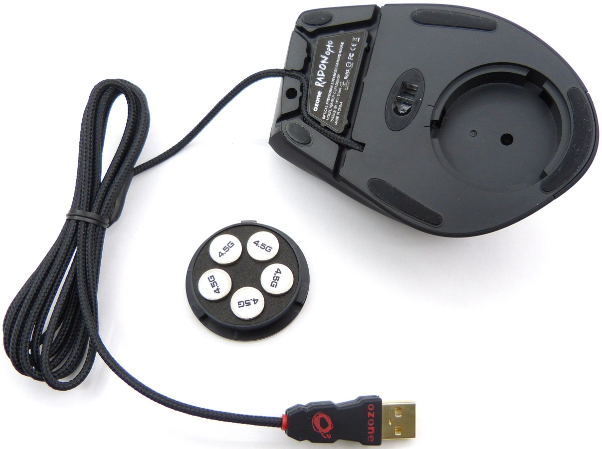 Para acceder a los pesos y así poder regular el peso global del ratón debemos girar su compartimento circular unos 5 grados antihorario para desbloquear su fijación. Una vez accedemos al compartimento nos hacemos con el aro de pesos, que no es más que un recinto circular con una espuma semirrígida donde se insertan a modo de molde los 5 pesos de 4.5 g. Cada peso es de metal inoxidable y marcado con su peso en gramos. Tal como está configurado el compartimento, podremos orientar un poco el peso global hacia un lado o hacia otro según nos convenga y jugando con la posición de los pesos. Lo cierto es que al ser una suma algo limitada, poco vamos a notar si no quitamos/añadimos varios pesos a la vez. No obstante, es cierto que este sistema de regulación de pesos es bastante acertado para jugadores que necesitan de mayor peso para mayor precisión y lentitud, o de mayor rapidez con menor precisión. Con un total de 5 pesos podremos regular hasta un total de 22.5g.