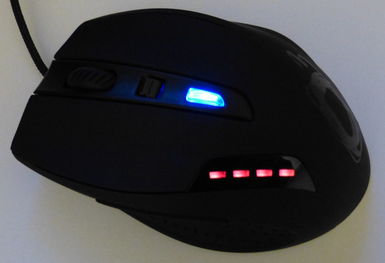 Tal como podemos ver en la imagen superior, tenemos una doble información aportada por la columna de 4 LEDs rojos que indican el nivel de DPI que estamos usando de sus 4 velocidades posibles (velocidad 1, un LED encendido, velocidad 2, dos LEDs encendidos, etc…) y el botón con LED de triple iluminación, azul, roja y magenta. Así que además de sus 8 mecanismos de pulsación tenemos una doble pantalla de iluminación a través de LEDs claramente identificados y colocados en las zonas más adecuadas para un acceso visual directo, sin que la mano estorbe demasiado al manejar el ratón.