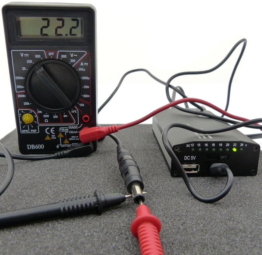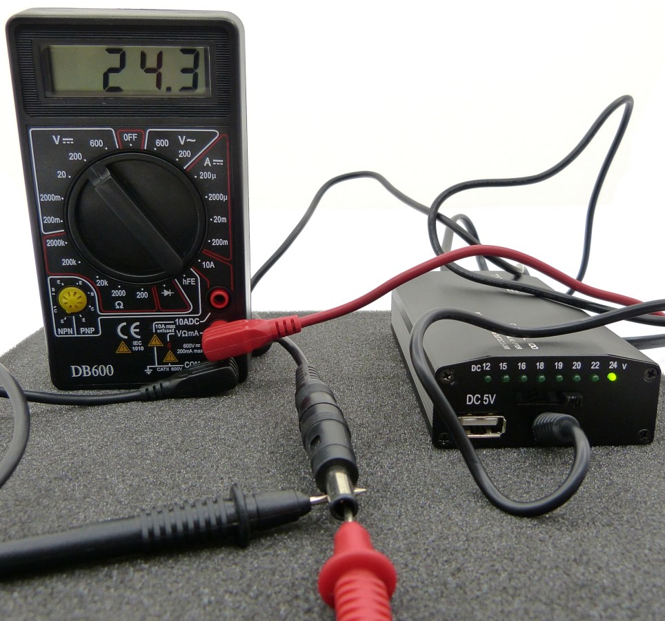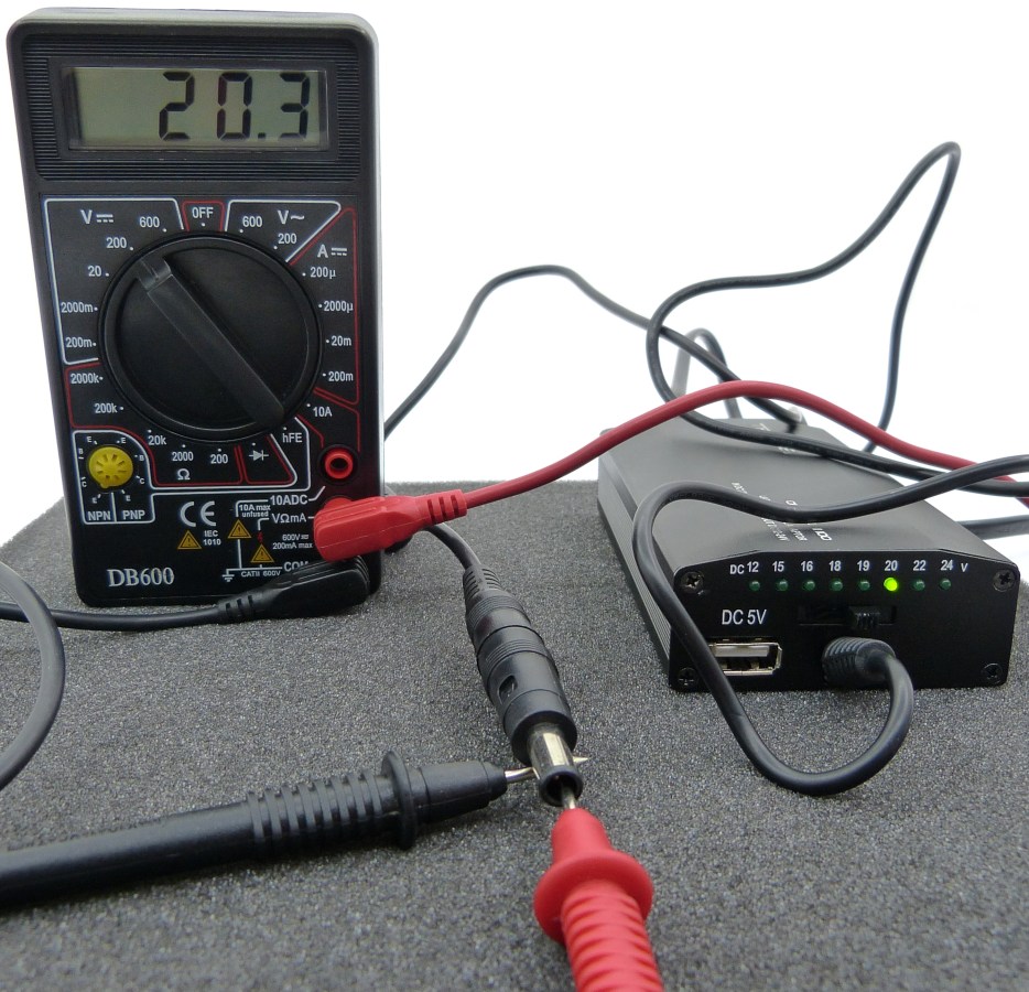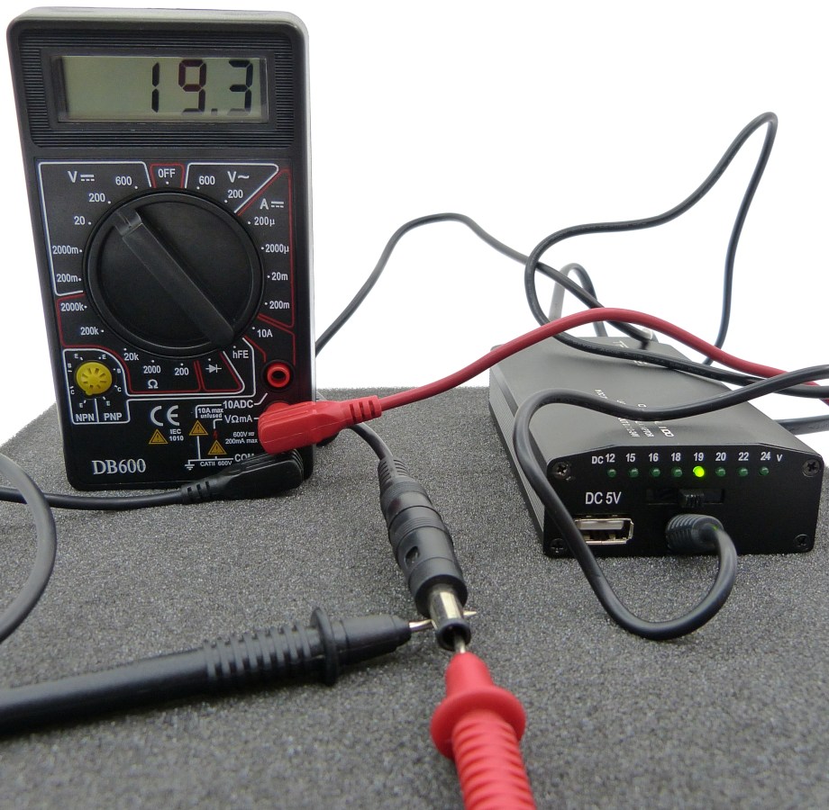 Para las pruebas de tensión, hemos pinchado la salida de CC para ver «a pelo», sin ningún aparato conectado, qué tensión real de corriente continua entrega. Como podemos ver, todas las tensiones están algo subidas en torno a los +0.2V a +0.6V, siendo estas medidas las esperadas para este tipo de transformador. Cuando se conecta algún portátil, la tensión correspondiente tiende a estabilizarse más al valor de referencia, siendo este el comportamiento más común de este tipo de aparatos.