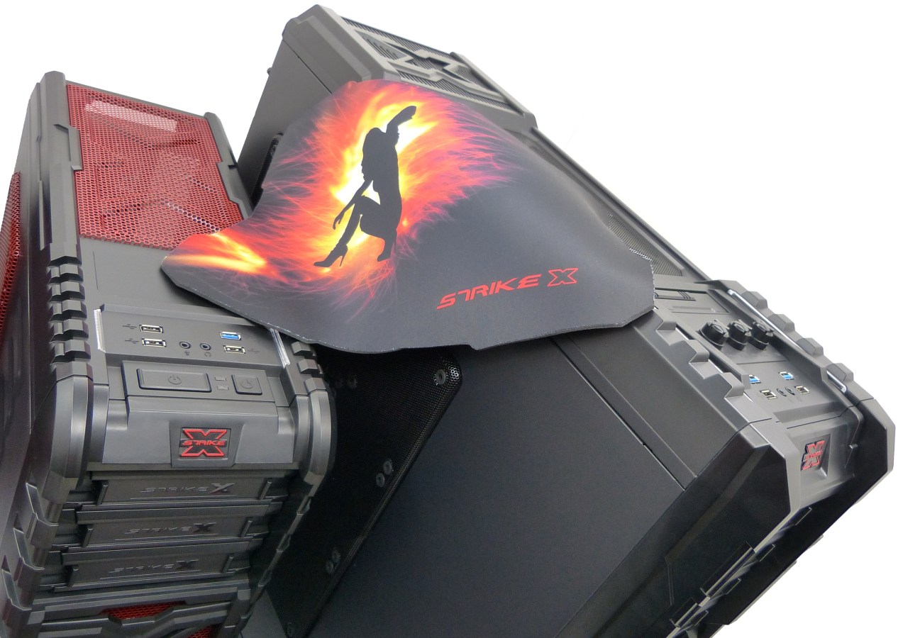 AEROCOOL 13 PRODUCTOS SERIE STRIKE-X. Strike-X X-Pad + StrikeX GT Devil Red+ Strike-X ST Black. Fotografía de Exposición Elaborada de Detalle III