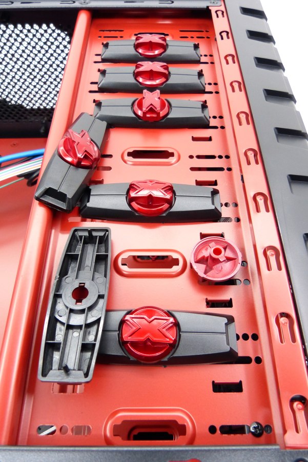 AEROCOOL STRIKE-X GT DEVIL RED. Detalle Sistema de Fijación sin tornillos Bahías de 5.25″ (Izquierda y Derecha, 2x 7)