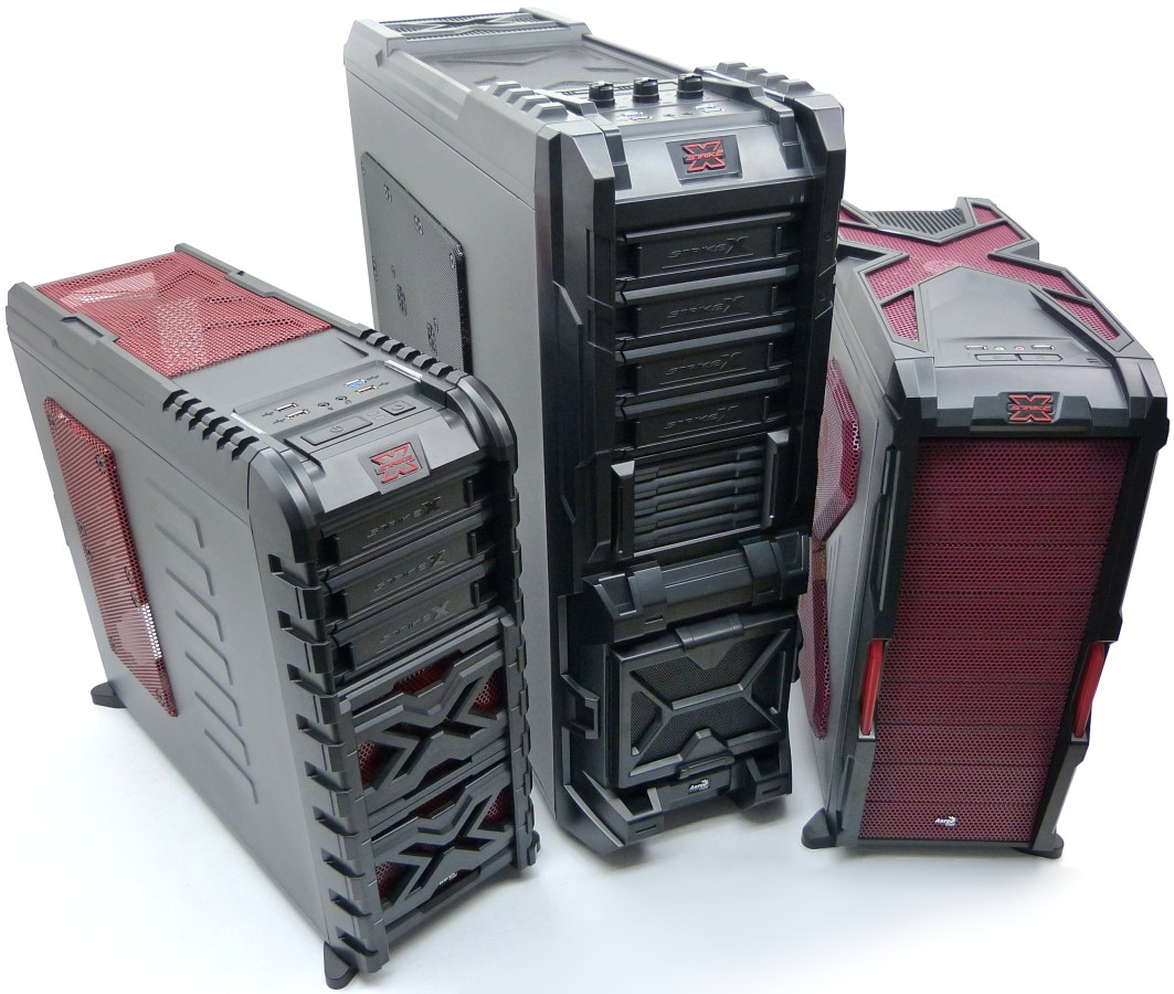 AEROCOOL STRIKE-X GT DEVIL RED. Fotografía de Exposición Conjunta. Semitorres Strike-X GT Devil Red + Strike-X Red + Supertorre Strike-X ST Black