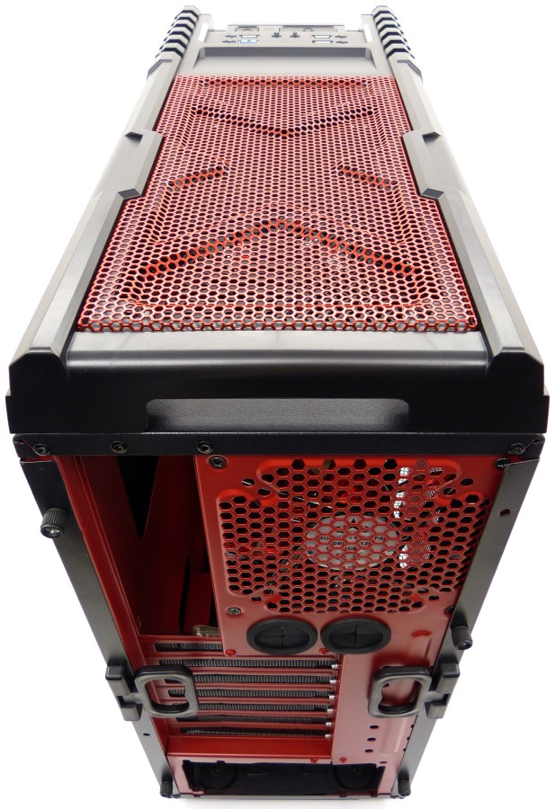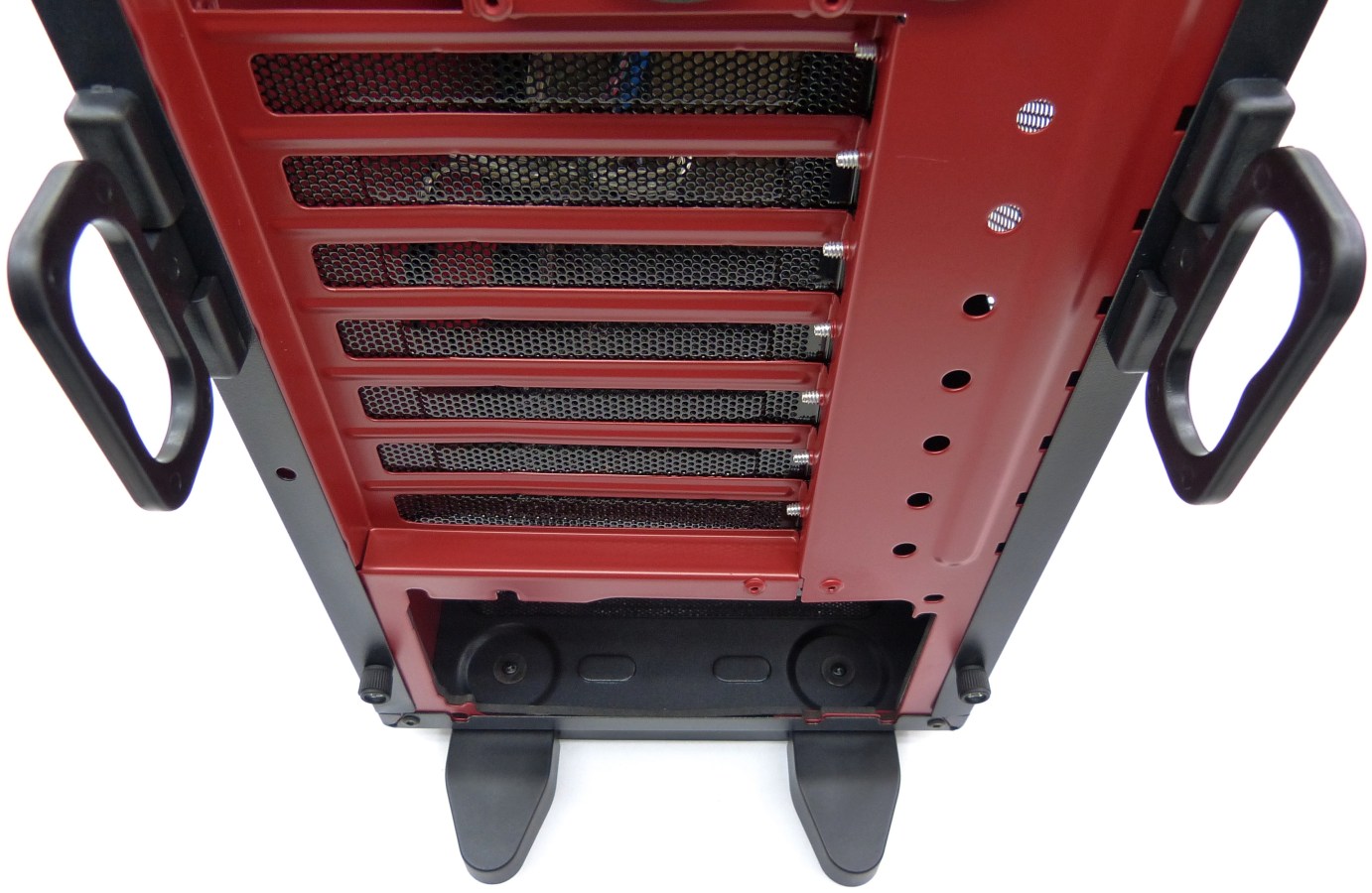 AEROCOOL STRIKE-X GT DEVIL RED. Detalle Trasera Inferior. Asas Laterales. Placas metálicas microperforadas PCI (x7) Encaje Fuente ATX Inferior