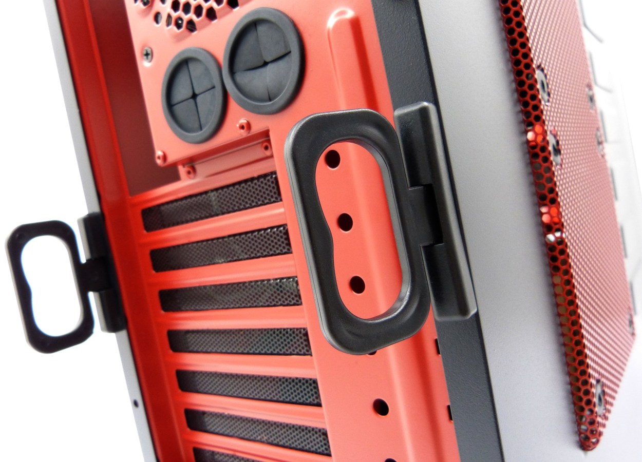 AEROCOOL STRIKE-X GT DEVIL RED. Detalle Asas Abatibles Atornilladas para Tapas Laterales. Giro de 90º. Detalle Sistema de 2 Pasa-Tubos de Goma