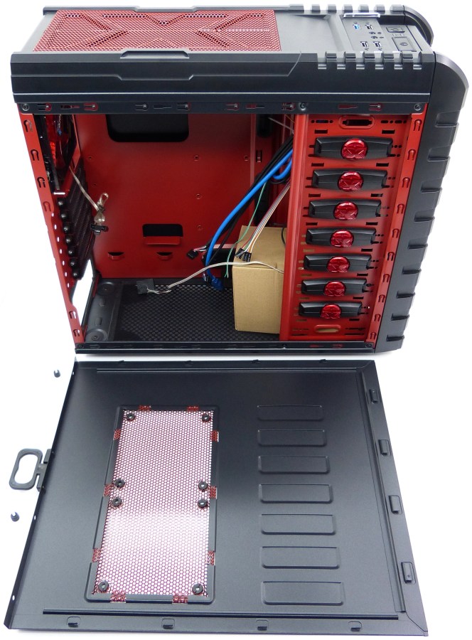 AEROCOOL STRIKE-X GT DEVIL RED. Detalle Soportes HDD 2.5″ o 3.5″/Conversores para FAN 12cm (x6 + 1 Preinstalado)