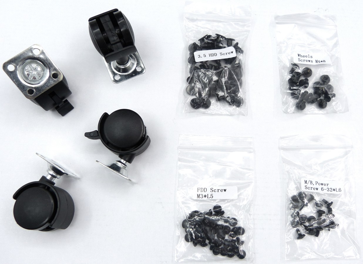 AEROCOOL STRIKE-X ST BLACK. Detalle General Ruedas con Freno y 4 Kits de tornillos