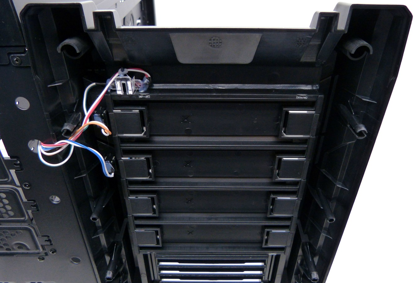 AEROCOOL STRIKE-X ST BLACK. Detalle Interior Frontal Superior. Tapas Bahías 5.25″ (x4)