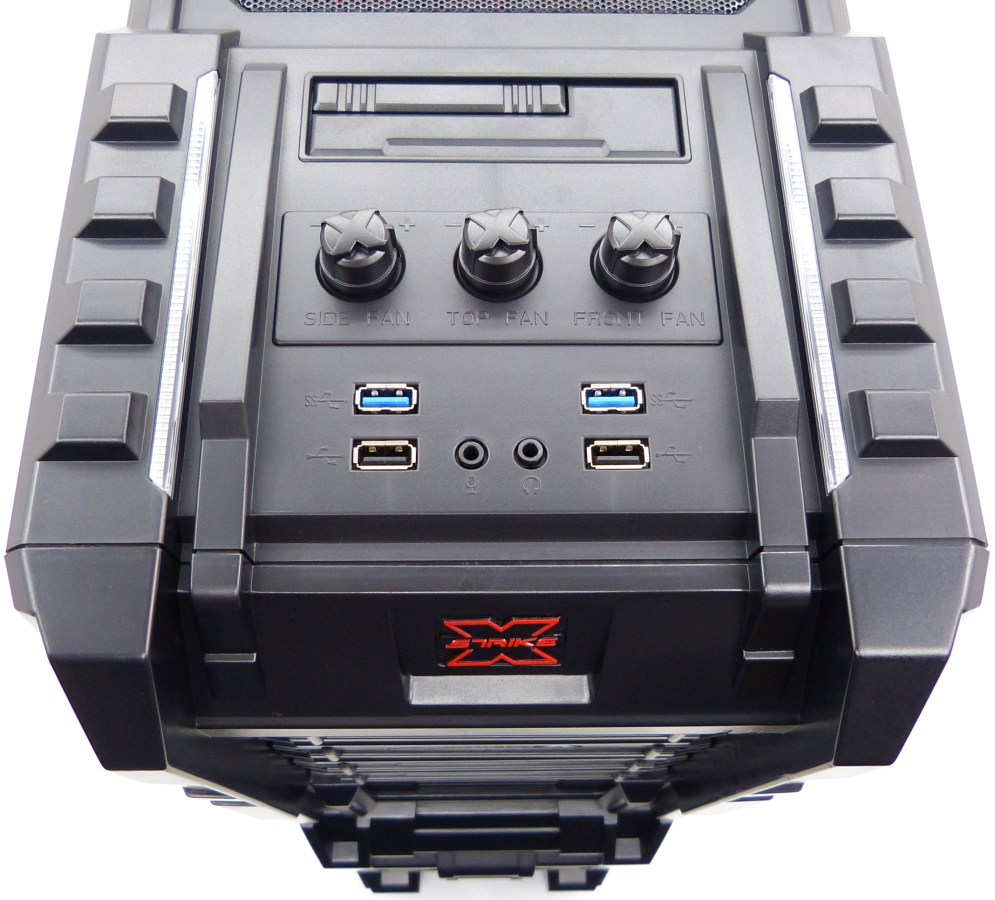 AEROCOOL STRIKE-X ST BLACK. Detalle Panel Superior de Conexiones (2x USB 2.0 + 2x USB 3.0 + jack 3.5mm micrófono + auriculares). Panel de Control RPM (x3 Potenciómetros)