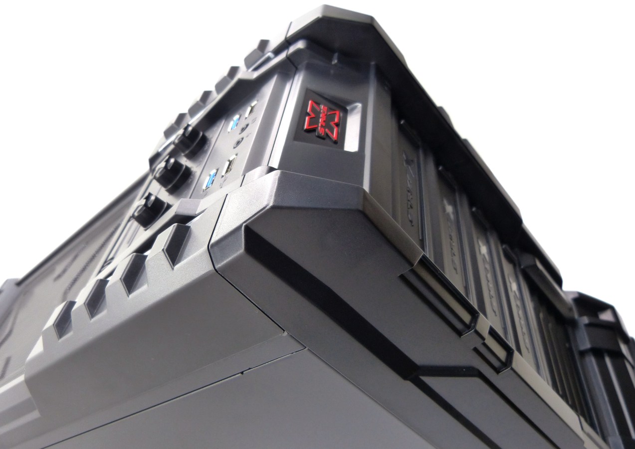 AEROCOOL STRIKE-X ST BLACK. Detalle Frontal Superior. Bahías de 5.25″