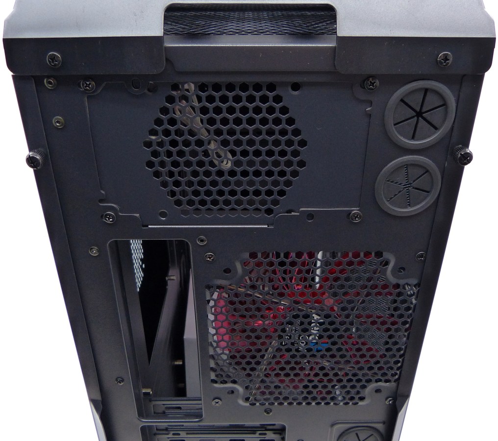 AEROCOOL STRIKE-X ST BLACK. Detalle Trasera Superior. Encaje Fuente ATX Superior (Compatible con 1x FAN 9cm). Ventilador de Extracción 14cm (Compatible también con 1x FAN 12cm)