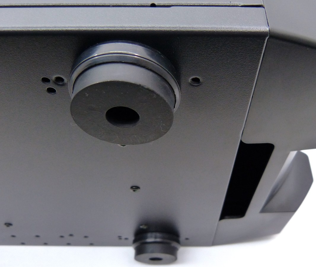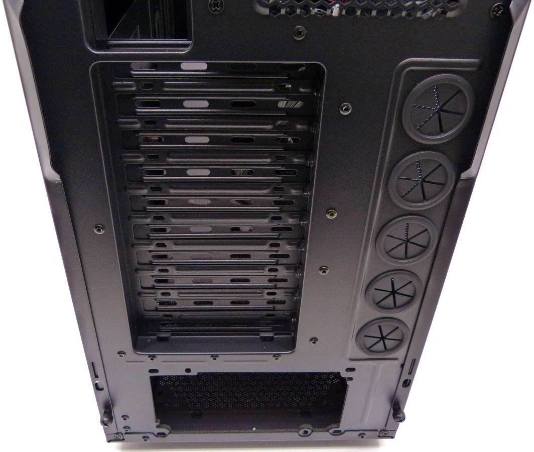 AEROCOOL STRIKE-X ST BLACK. Detalle Trasera Inferior. Placas Metálicas PCI (x10). Sistema de 5 Pasa-Tubos de Goma. Encaje Fuente ATX Inferior