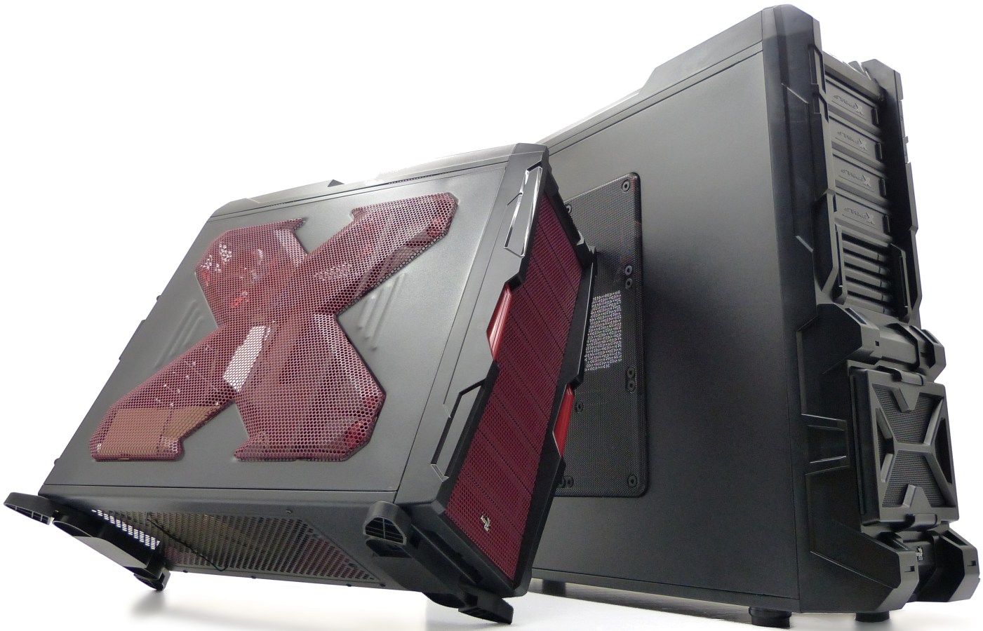 AEROCOOL STRIKE-X RED. Fotografía de Exposición Conjunta. Semitorre Strike-X Red + Supertorre Strike-X ST Black