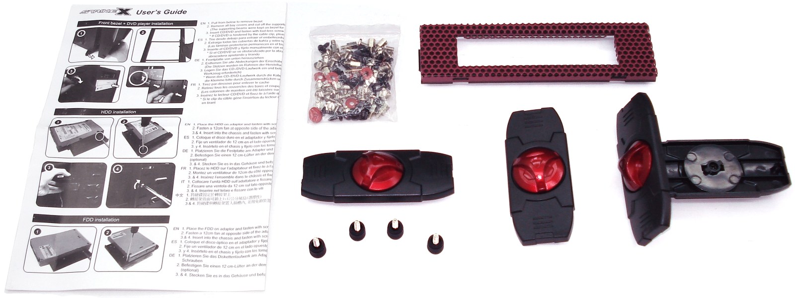 AEROCOOL STRIKE-X RED. Detalle Accesorios. Manual, Clips para Bahías frontales, Kit de Tornillos, Frontal para 3.5″