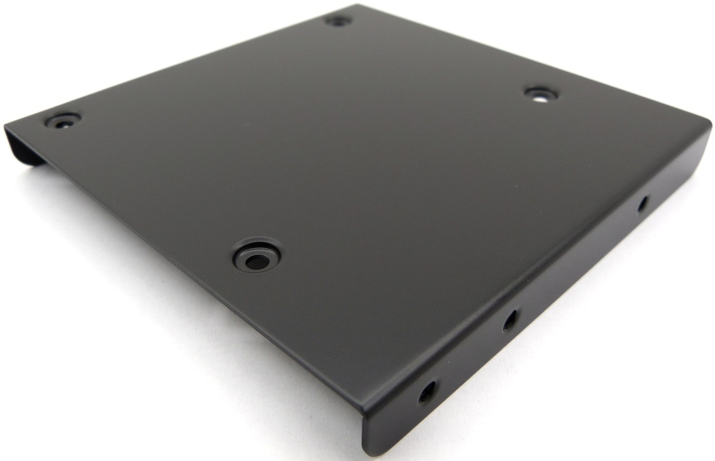 - Montaje con adaptador sobre la bahía de 3.5″ en el interior de un PC de sobremesa. En este montaje hace falta emplear los 4 + 4 tornillos, usando el adaptador como puente entre la torre y la unidad SSD.