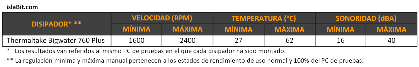 THERMALTAKE BIGWATER 760 PLUS. Tabla de Rendimiento y Sonoridad