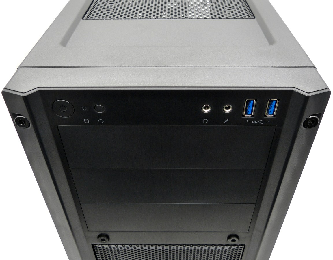 CORSAIR CARBIDE SERIES 300R. Detalle Panel Frontal Superior de Conexiones. Botones Encendido/Apagado y Reset. LED de Actividad. Doble conector jack 3.5mm para Auriculares y Micrófono. Doble conector USB 3.0 en Vertical. Detalle Tapas Frontales Bahías 5.25″