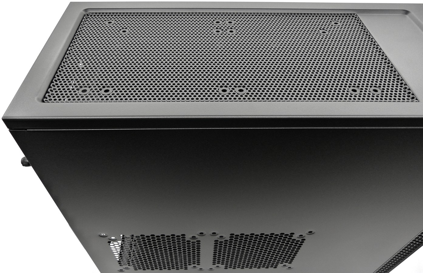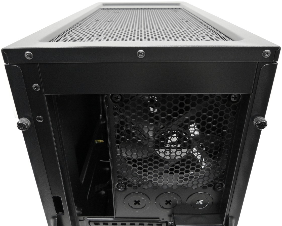CORSAIR CARBIDE SERIES 300R. Detalle Lomo Perforado Superior Tipo Mesh. Lateral Derecho Compatible con 2 Ventiladores 12/14cm, Perforado Hexagonal