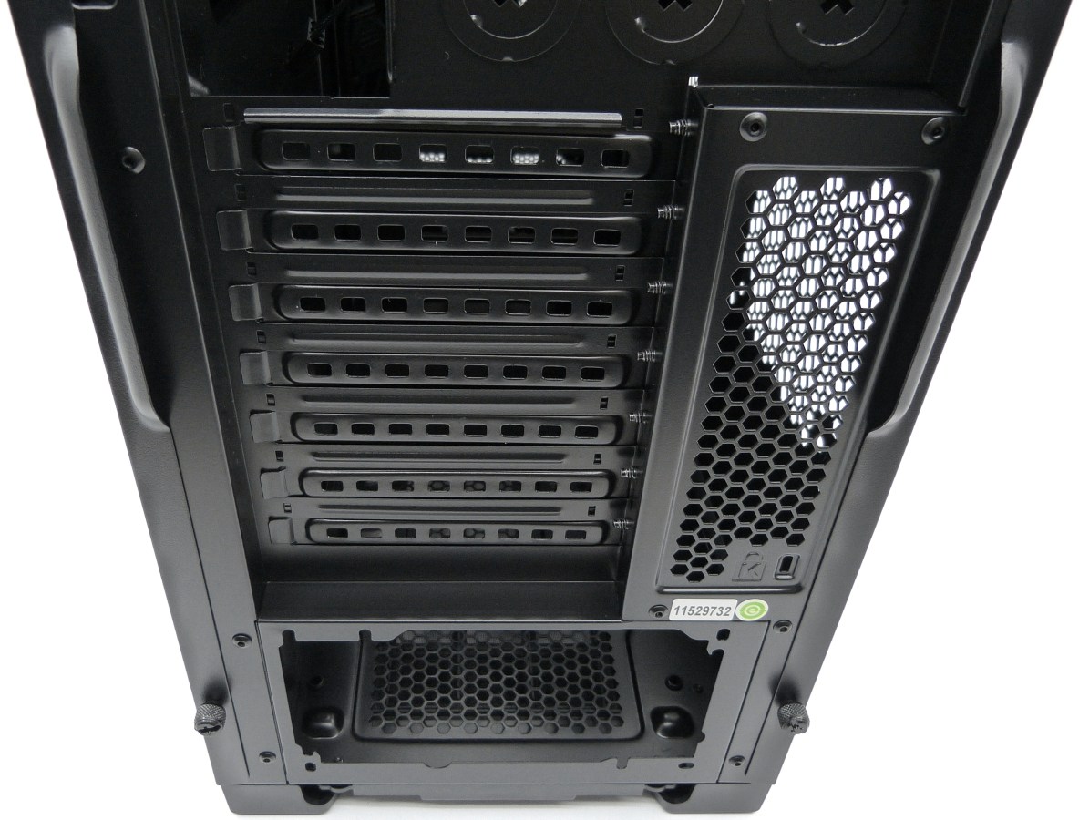 CORSAIR CARBIDE SERIES 300R. Detalle Trasera Intermedia-Inferior. Placas Metálicas PCI (x7) Montaje por Tornillería. Perforado Lateral Perforación Hexagonal. Salida Inferior Fuente de Alimentación