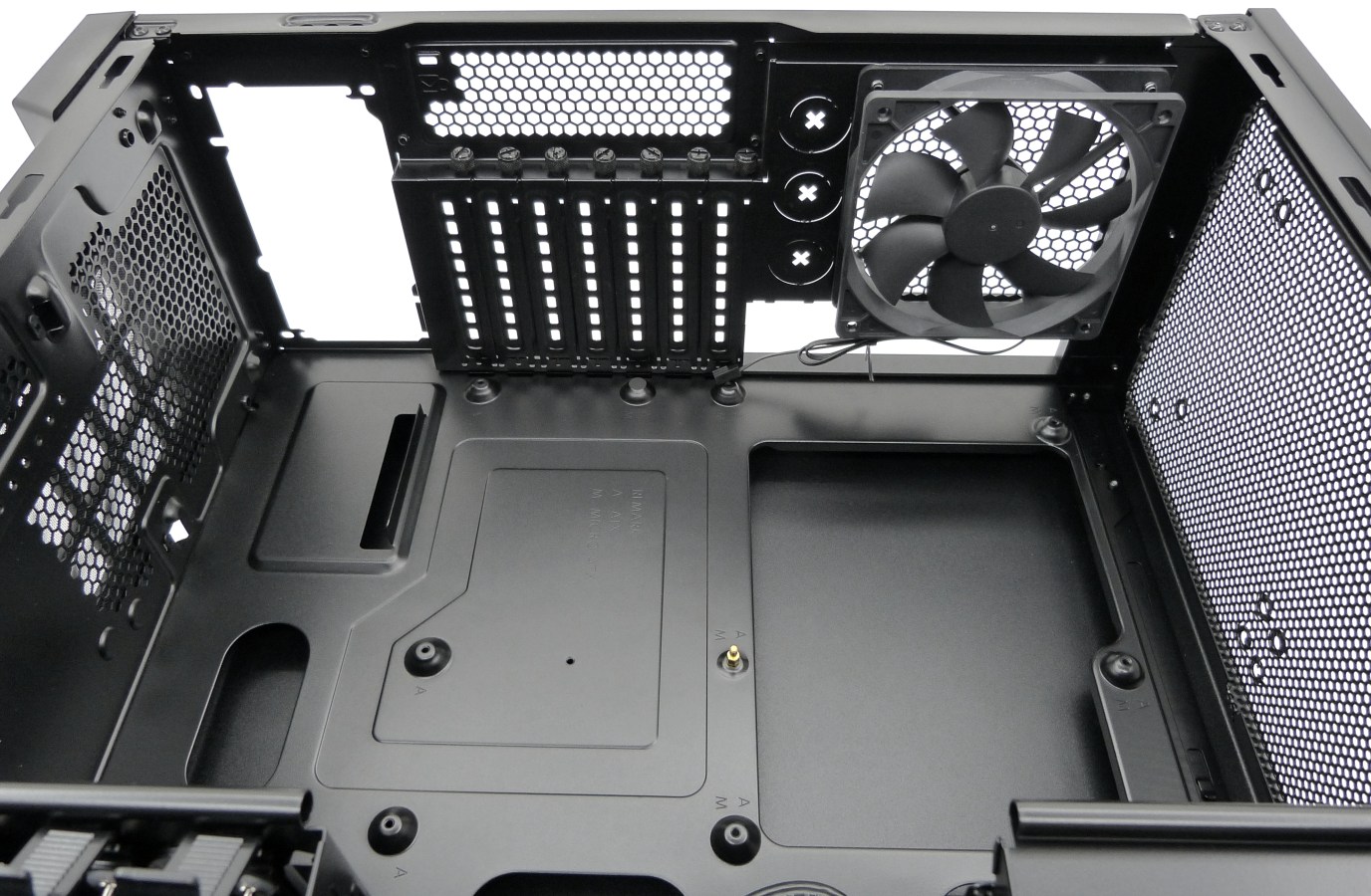 CORSAIR CARBIDE SERIES 300R.Detalle General Interior Sección Trasera. 6 Partes: Ventilador 12cm, Salida Placa Base, Triple perforación para RL, 7 Tapas PCI Metálicas Montadas por Tornillería, Perforado Hexagonal, Salida Fuente de Alimentación