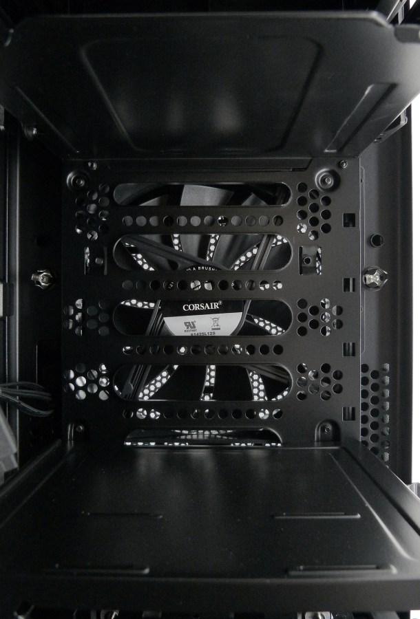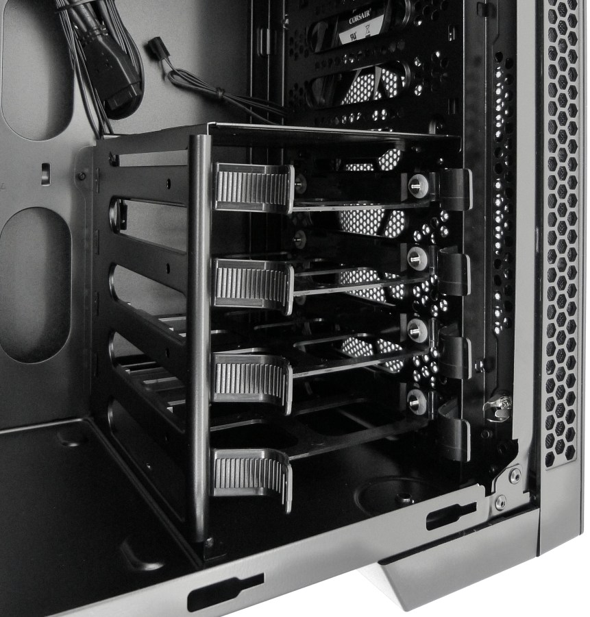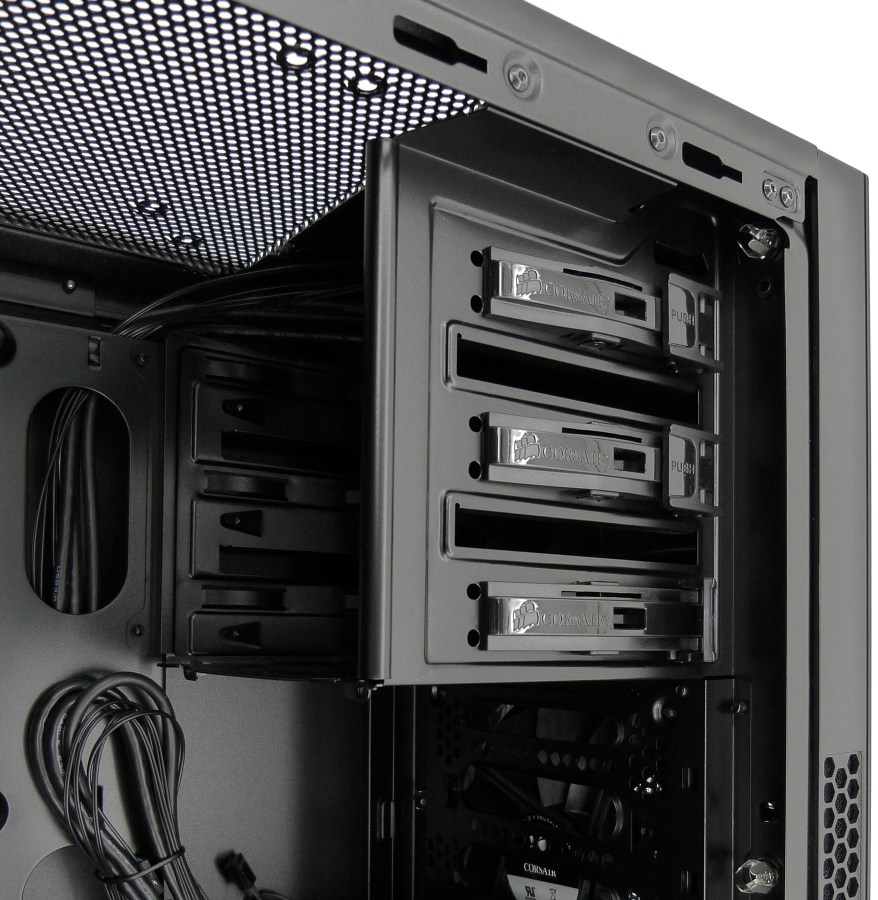 CORSAIR CARBIDE SERIES 300R. Detalle Zona Bahías Internas 3.5″/2.5″ con 4 Bandejas Correderas Antivibración