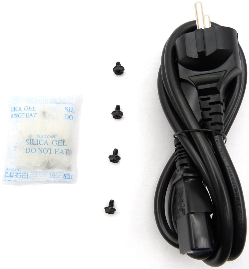 ANTEC VP550P. Detalle Accesorios. Bolsa Silica Antihumedad, 4 Tornillos de Montaje y Cableado de Alimentación CA